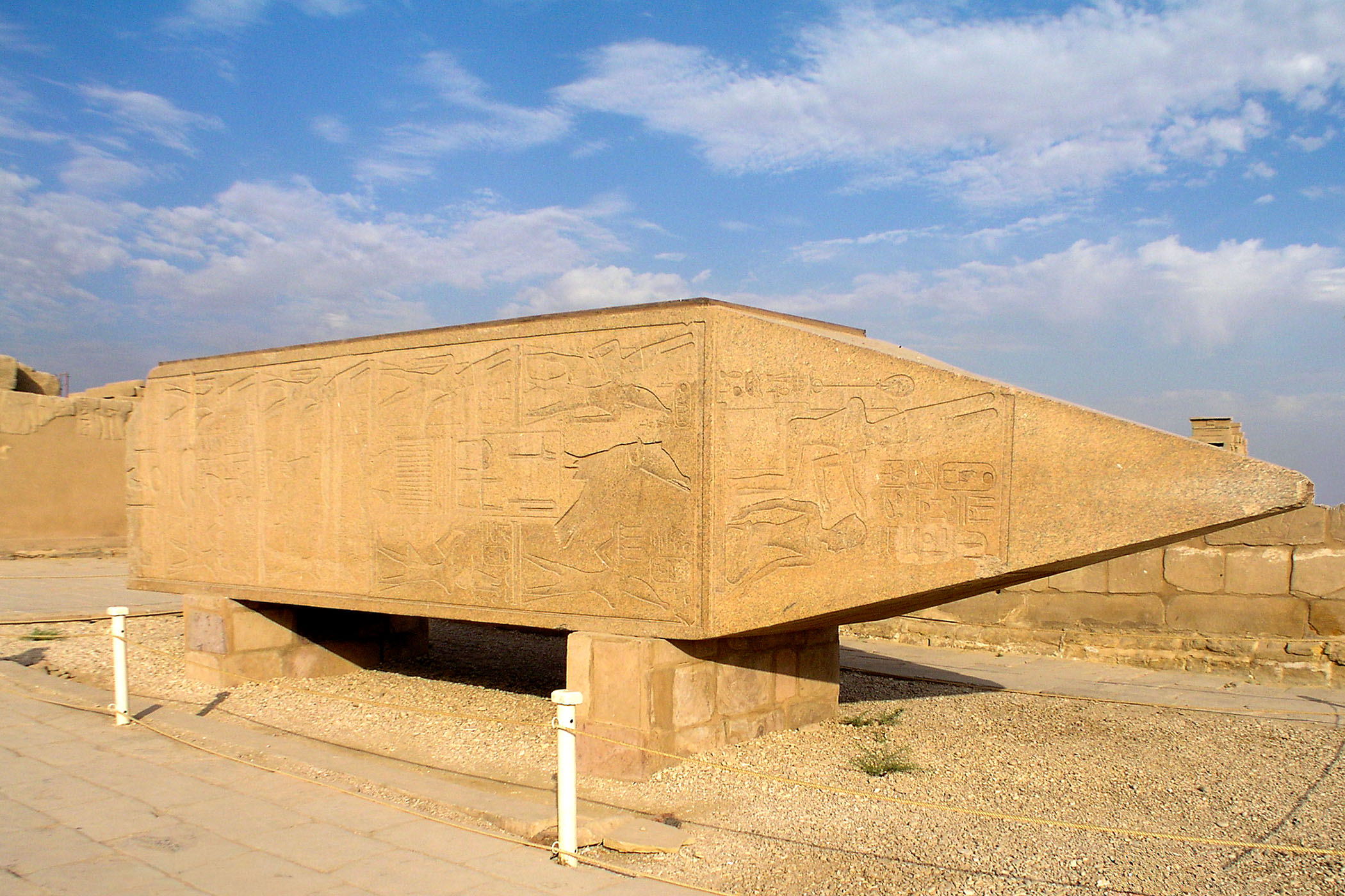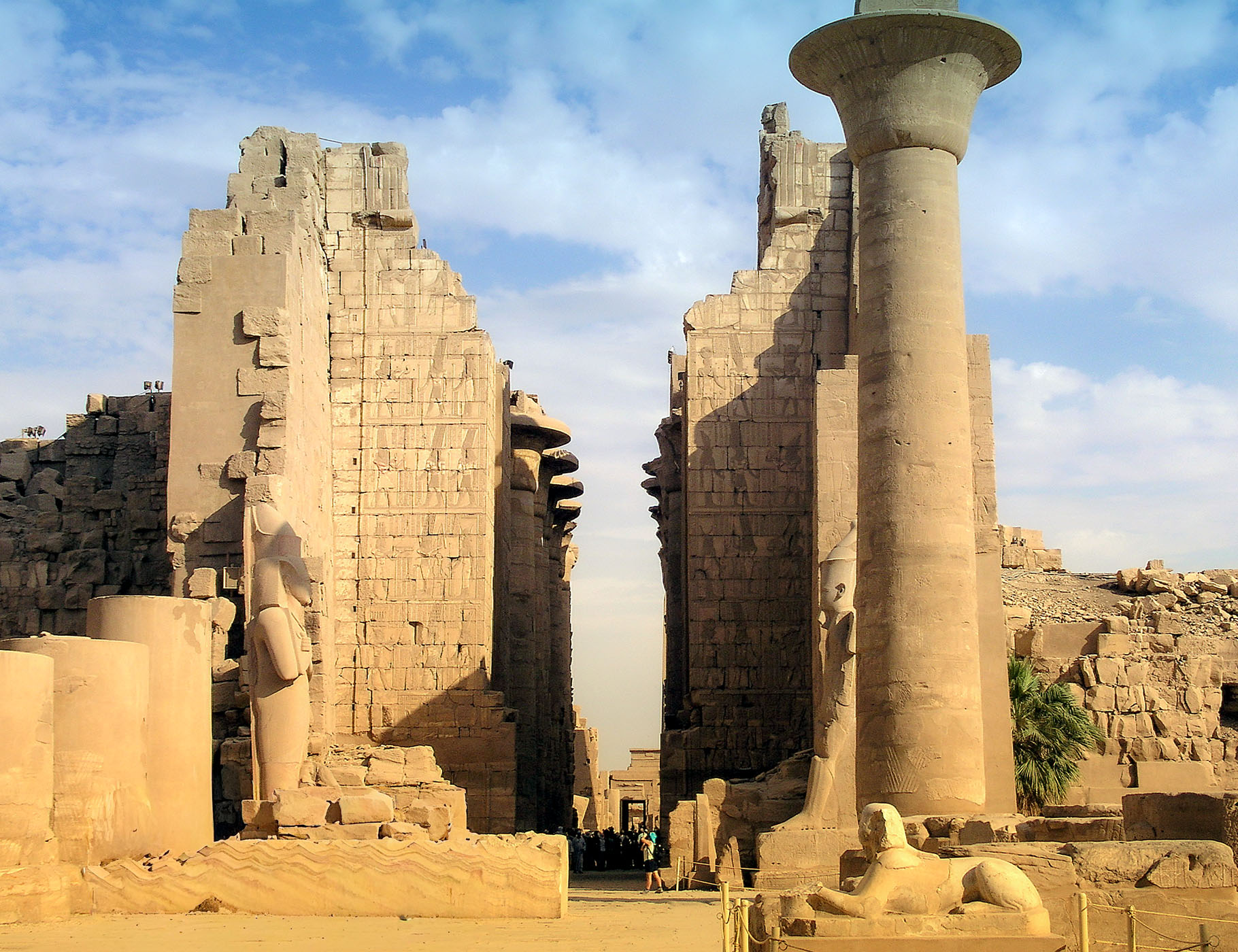 Der große Tempel von Karnak hat eine sehr verwirrende Baugeschichte. Die ältesten, heute zerstörten Teile aus dem Mittleren Reich, bilden das Zentrum der Anlage. Unter den des Neuen Reiches ab 1551 v. Chr. wurde die Anlage zunächst in der Hauptachse nach Westen erweitert. Thutmosis ließ dann einen Pylon rechtwinklig nach Süden anbauen und schuf so eine neue Achse, die ebenfalls sukzessive erweitert wurde. Der letzte Bauabschnitt, der erste Pylon, stammt so aus einer Zeit, als das pharaonische Ägypten schon längst untergegangen war. Das erste Tempeltor wird von zwei gewaltigen Türmen aus Sandstein flankiert.