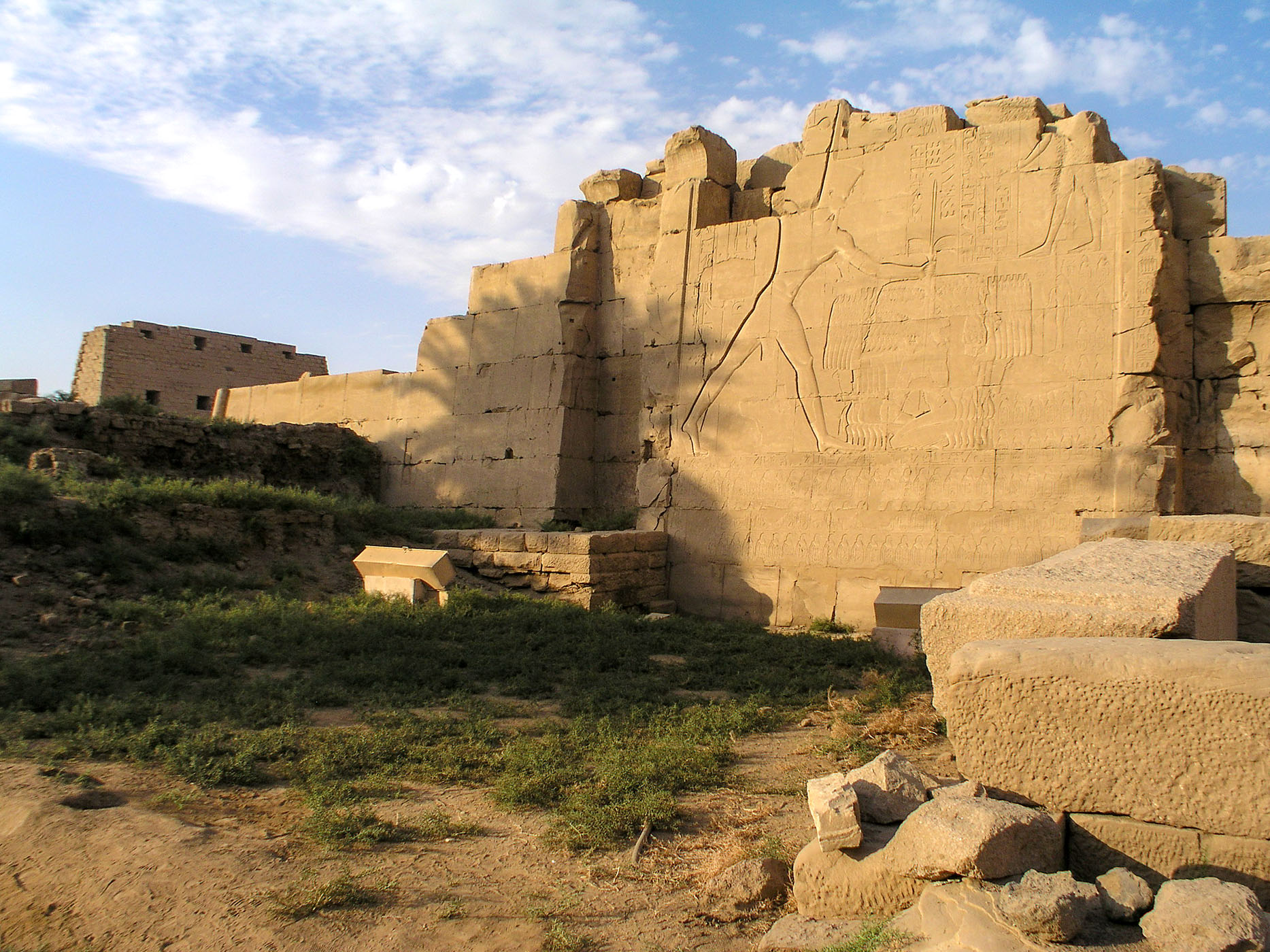 Oft zerstörte ein Pharao die Bauwerke seiner Vorgänger, um Platz für ein neues Heiligtum zu schaffen. Sie alle veränderten, verschönerten und erweiterten über die Jahrtausende die Tempel von Karnak. Und Amun-Re, gegenwärtig in der Goldstatue in einem kleinen Gebäude im Zentrum der Anlage, leuchtete in der Dunkelheit. Das Tor gehörte zu einer doppelten Umfassungsmauer, die Ramses III. errichten ließ und die den gesamten Komplex mit zwei Tempeln, dem Königspalast und den Anbauten von Wohnungen für Priester, Offiziere und Beamte, Magazinen und Stallungen umgab. In der römischen Zeit wurde das ehemalige Heiligtum als Wohnanlage genutzt; die Kopten legten im zweiten Hof des großen Tempels eine große Kirche an. Die gesamte Anlage bedeckt eine Fläche von 8 ha. Ein zeitgenössischer Text aus der Zeit Ramses`III. berichtet, daß 62 626 Kriegsgefangene für den Bau des Tempels eingesetzt wurden.