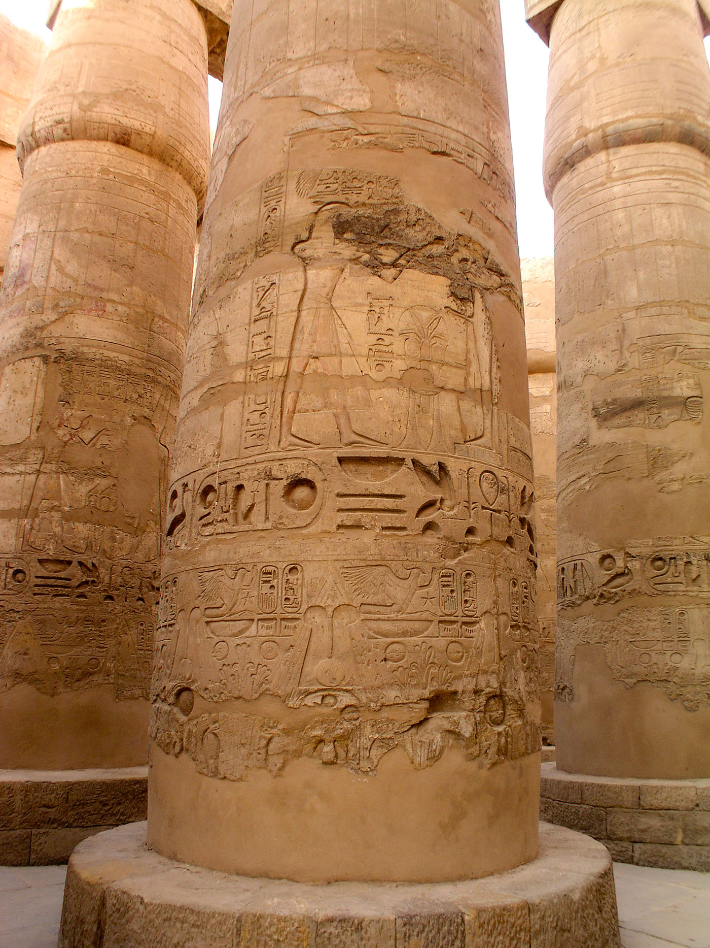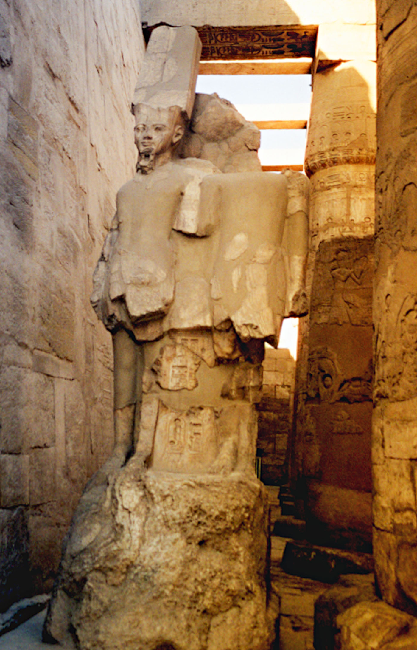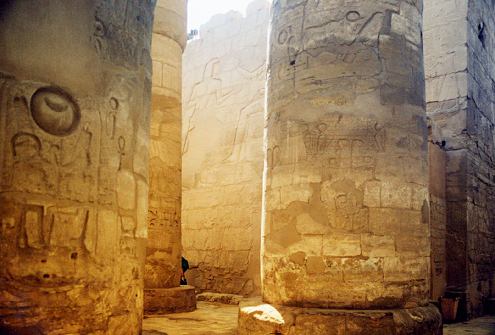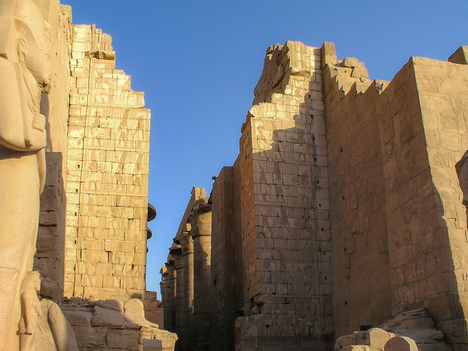 Vom Eingang, dem Ersten Pylon aus der 30. Dynastie, gelangt man immer tiefer in die Vergangenheit, durchschreitet die Kolonnade aus der 25. Dynastie, passiert links den Koloss, auf den ein Priesterkönig rund 300 Jahre früher seinen Namen schreiben ließ, und betritt den großen Säulensaal.