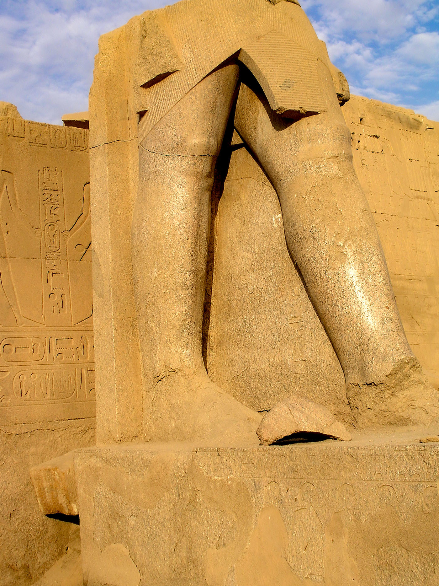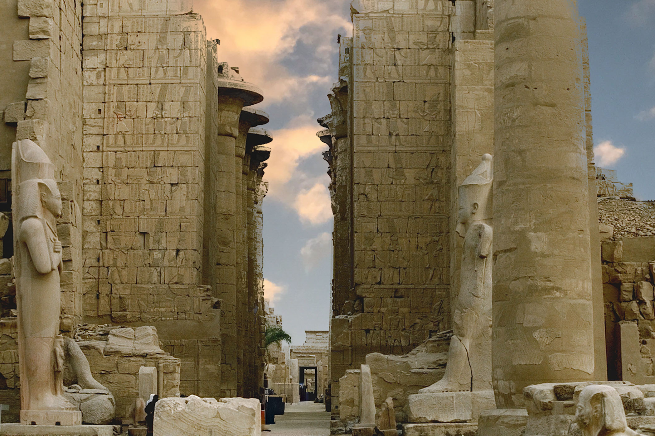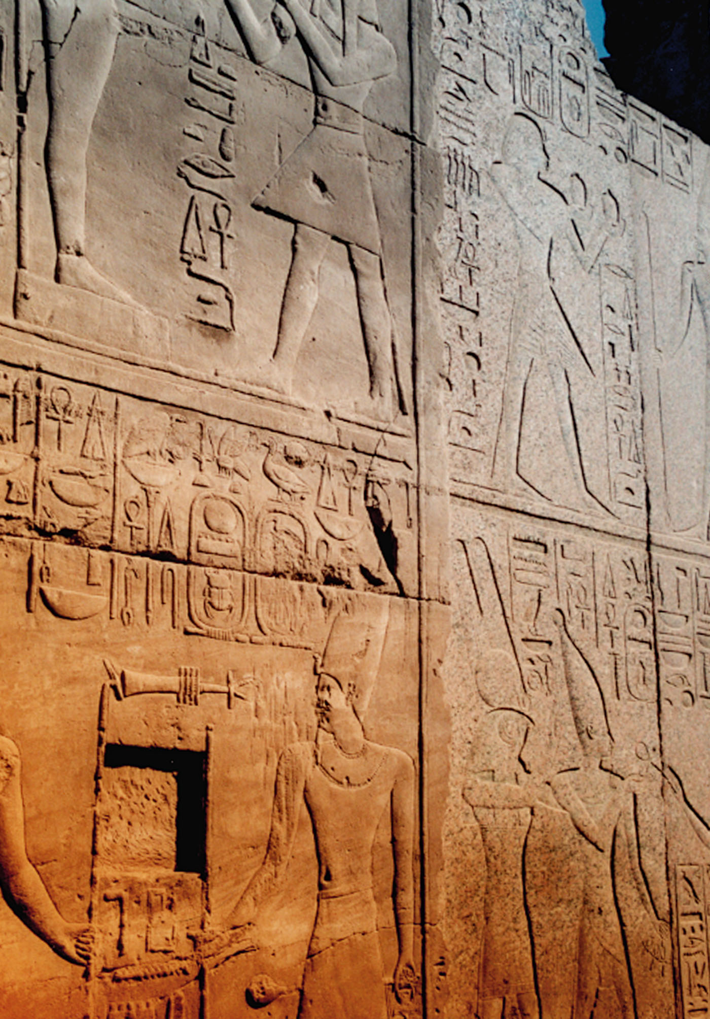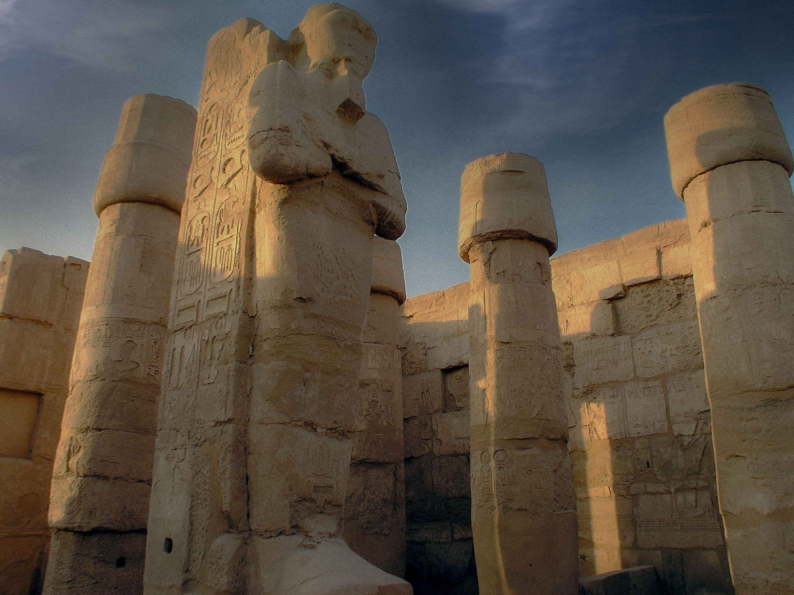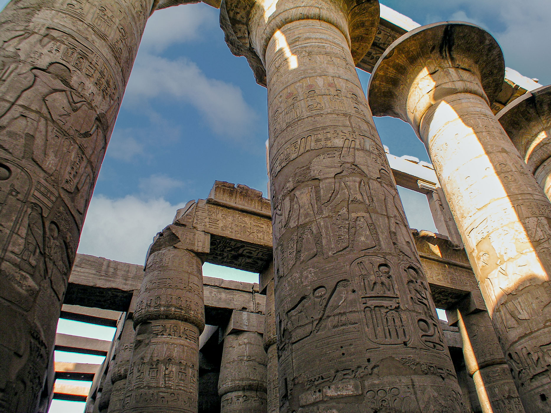 Vom Eingang, dem Ersten Pylon aus der 30. Dynastie, gelangt man immer tiefer in die Vergangenheit, durchschreitet die Kolonnade aus der 25. Dynastie, passiert links den Koloss, auf den ein Priesterkönig rund 300 Jahre früher seinen Namen schreiben ließ, und betritt den großen Säulensaal.