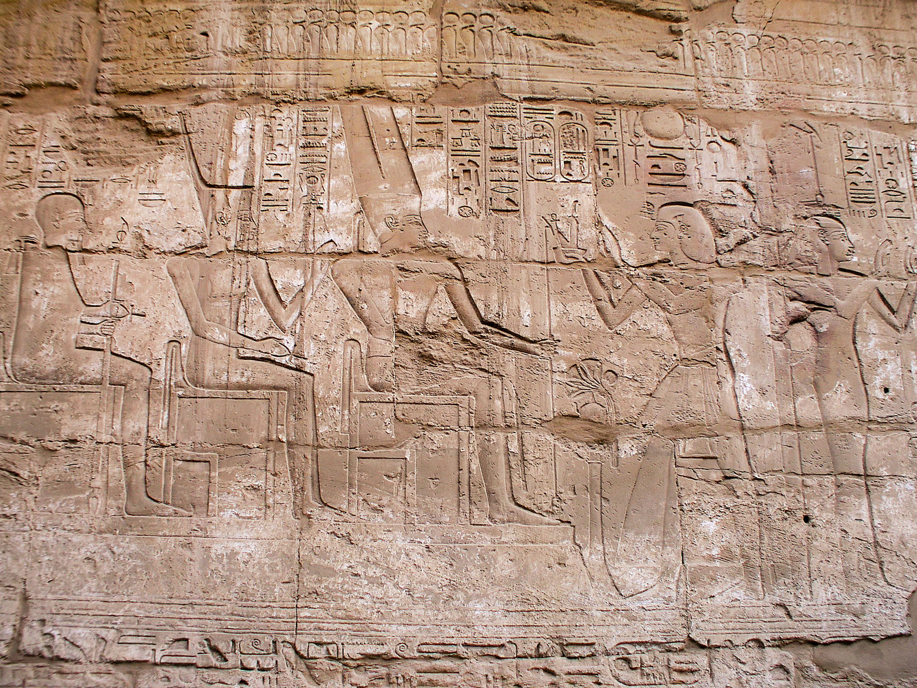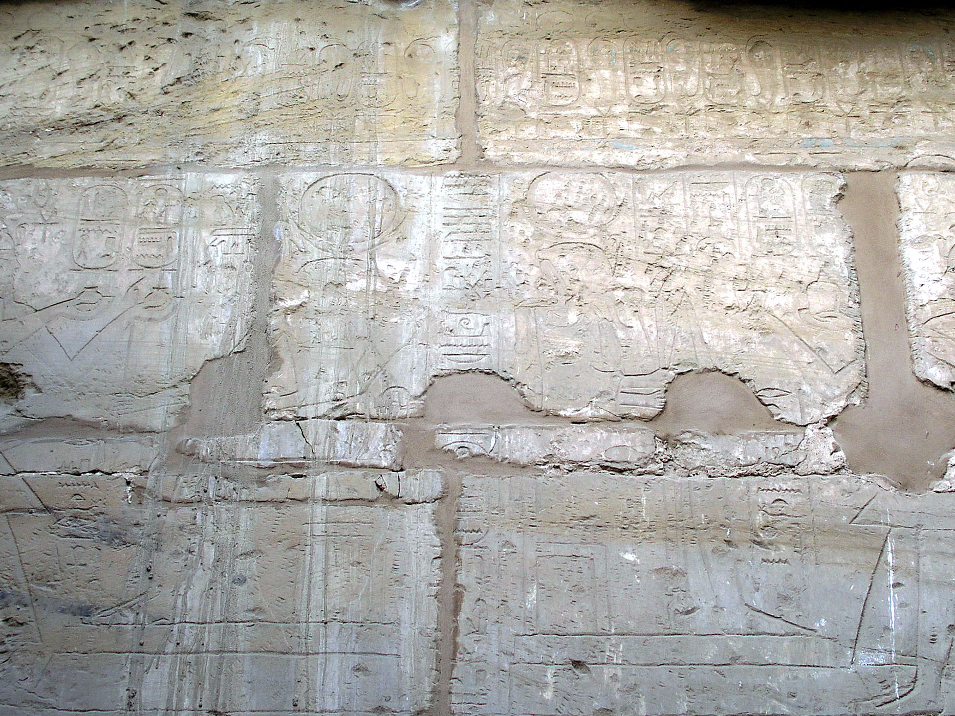 Auf dem eingemeiselten Bildnis erkennt man, wie Amun Hatschepsut die Krone der aufsetzt. Bei näherer Betrachtung der Hieroglyphen- Kartuschen kann man Ausbesserungen auf etwas vertieften Mulden erkennen. Dort hatte der “Kulturrevolutionär” Echnaton den Namen des Amun tilgen lassen; spätere Herrscher besserten die zerstörten Flächen dann wieder aus.