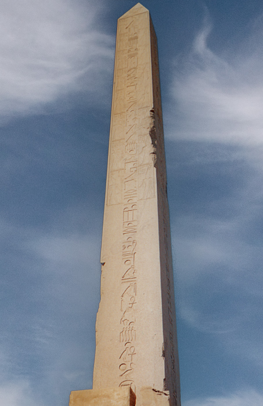 Den hinteren Abschluss des großen Säulensaals bildet der dritte Pylon mit einem Vorbau. In ihm waren große Reliefblöcke von insgesamt 13 verschiedenen Heiligtümern früherer Zeit verbaut. Den Mittelhof schmückten einst zwei von Thutmosis I. und zwei von Thutmosis III. geweihte Obelisken. Als größter Obelisk von Karnak ragt hinter dem vierten Pylon der der Hatschepsut auf. Eines der Vorrechte von Königinnen war die Errichtung von Obelisken. Hatschepsuts Vater, Thutmoses I., hatte mehrere dieser Kultsymbole bauen lassen, aber Hatschepsuts Obelisken überragen die ihres Vaters. Im Herzen des Tempels von Karnak lässt sie zwei der größten Obelisken Ägyptens aufstellen. Er überragt den Tempelkomplex um fast 30m. Er ist 29,50 m hoch und besteht aus Rosengranit, seine Spitze war mit einer Legierung aus Gold und Silber (Elektron) überzogen.