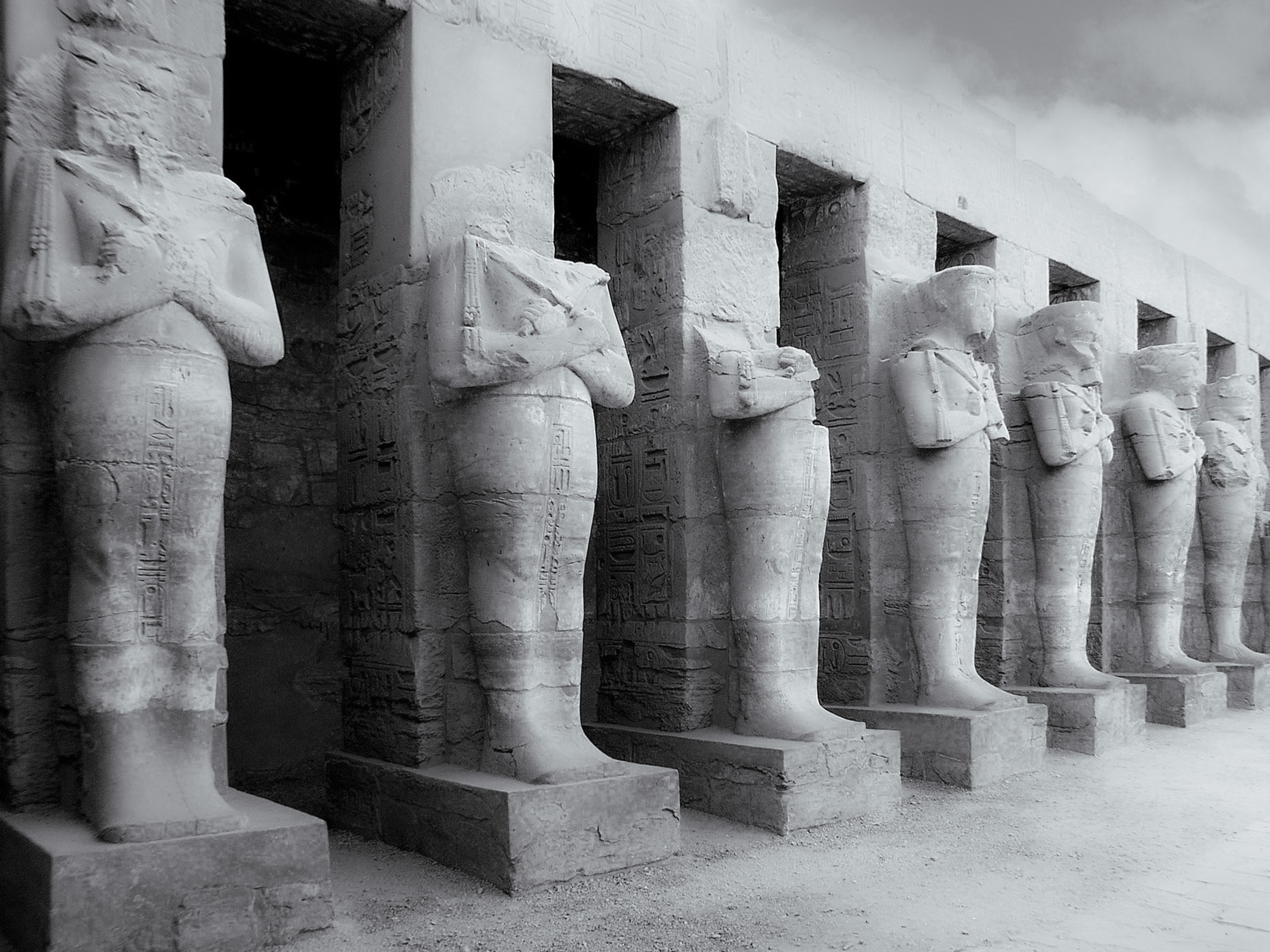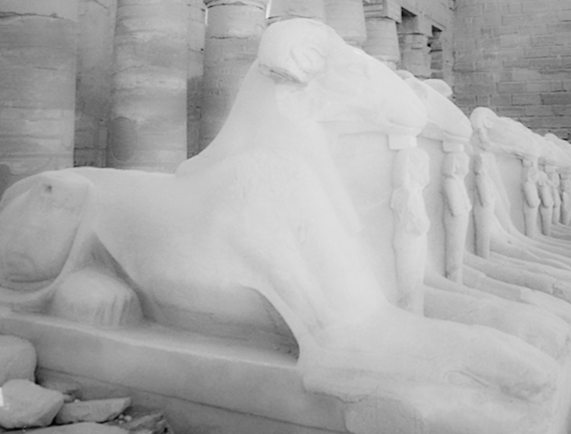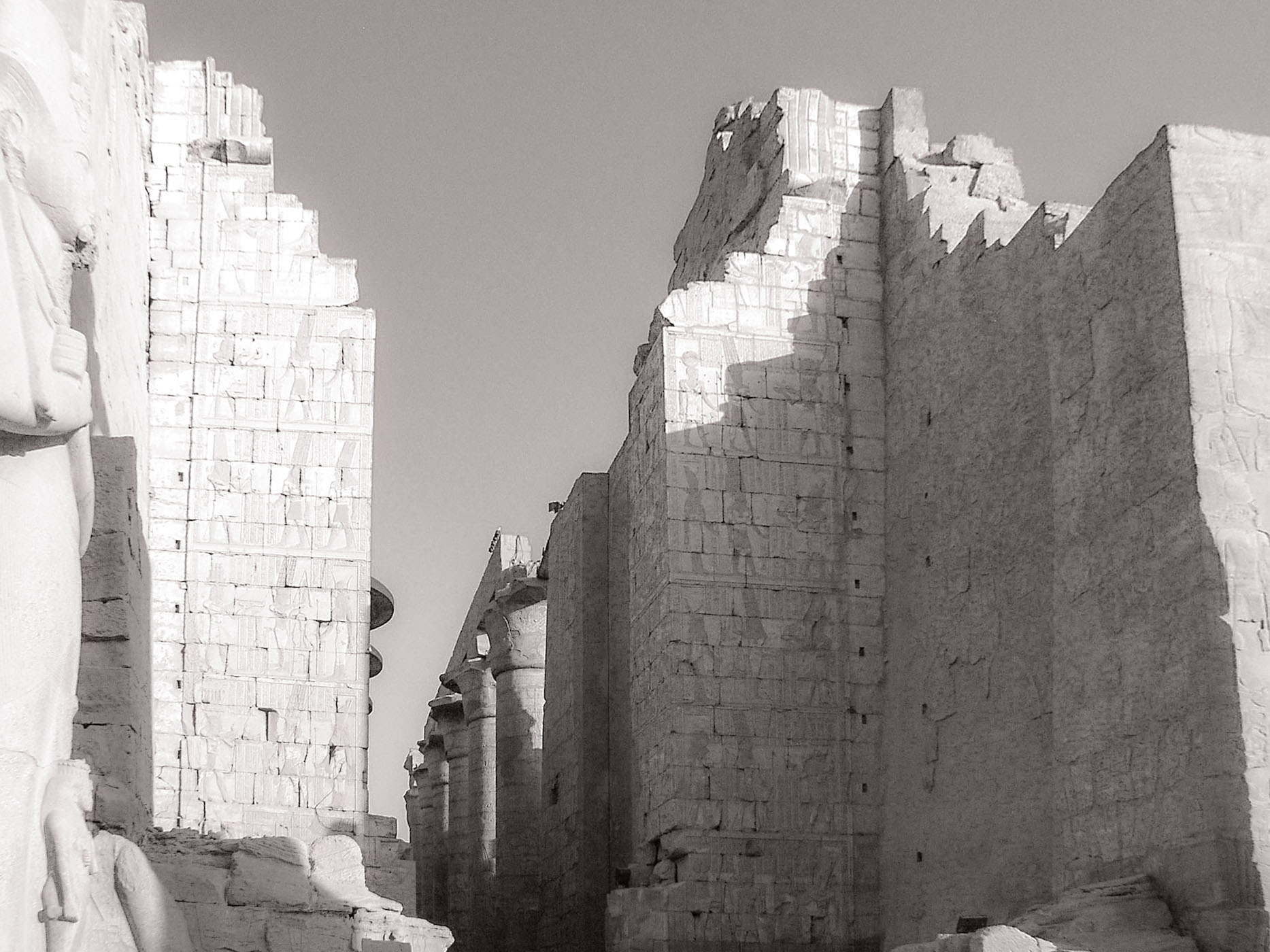 Vom Eingang, dem Ersten Pylon aus der 30. Dynastie, gelangt man immer tiefer in die Vergangenheit, durchschreitet die Kolonnade aus der 25. Dynastie, passiert links den Koloss, auf den ein Priesterkönig rund 300 Jahre früher seinen Namen schreiben ließ, und betritt den großen Säulensaal.
