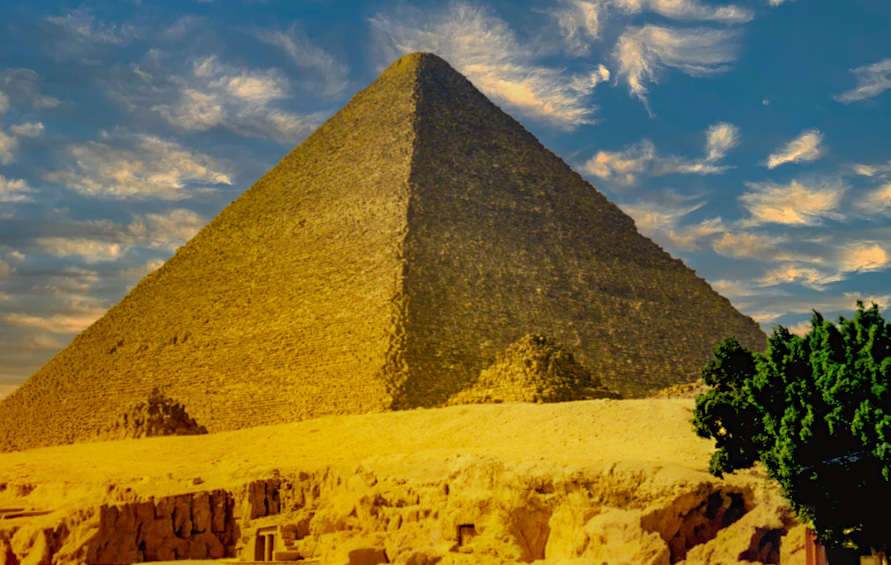 Cheops (Khufu), Sohn des Snofru (Snefru) und Vater von Chephren war der Erbauer dieser Pyramide, auch Große Pyramide genannt. Sie ist die bekannteste der Pyramiden und war 147 m hoch. Heute sind es 10 m weniger, da die Spitze abgestumpft ist. Das ursprüngliche Gesamtvolumen betrug 2,5 Mio. Kubikmeter und ist auf 2,35 Kubikmeter verkleinert, da das wertvoll behauene Material bis zum Jahre 1800 v.Chr. für die Bauten von Kairo weggeschleppt wurde. Gemäß der üblichen Anordnung befindet sich der Eingang auf der Nordseite. Die Korridore waren nach den Fixsternen ausgerichtet, die niemals vom Horizont verschwanden. Der jetzige Eingang liegt tiefer als der ursprüngliche. Erst nachdem man einen nachträglich gegrabenen Grabräuber-Stollen durchquert hat, gelangt man zum eigentlichen Zugang. In der Pyramide gibt es nichts zu sehen außer der Pyramide selbst – und die merkwürdige Vorstellung in einem künstlichen Berg gefangen zu sein.